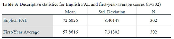 The descriptive statistics for the participants' performance on the English FAL examination in relation to their end-of-first-year average performance are captured in Table 3 below.