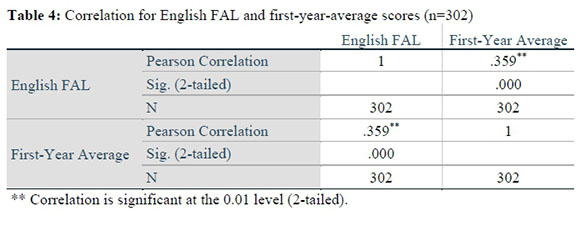 Table 4 below presents the results of a correlational analysis of the participants' performance on the English FAL examination and their end-of-first-year average scores.