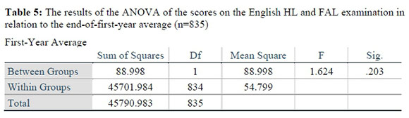 In Table 5 below, the results are captured of an ANOVA for the English HL and FAL participants' scores on their English examination in relation to their end-of-first-year average performance.