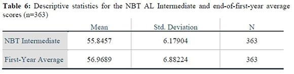 Table 6 below presents the descriptive statistics for the participants' scores within the Intermediate band of the NBT AL in relation to their end-of-first-year average performance.