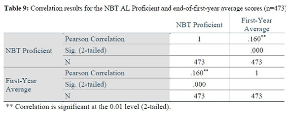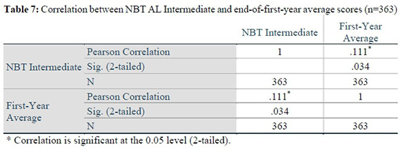 As is clear in the table, the correlation coefficient for the Intermediate NBT AL scores and the end-of-first-year average performance amounted to .111 with a p value of .034.