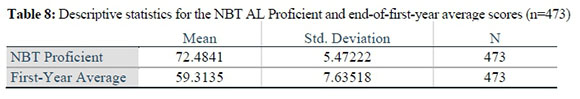 In Table 8 below, the descriptive statistics are presented of the participants' scores within the Proficient band of NBT AL and their end-of-first-year average performance.