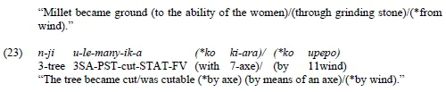 The instrument nungu 'pot' in (20.a) is interpreted as the potential or possible tool used in carrying out the cooking event. On the one hand, the instrument in (20.a) modifies the participant rather than the event described by the verb. On the other hand, in (20.b), the event described by the verb is stated to be possible by means of such an instrument, and the instrument modifies the entire event rather than the participant (argument).