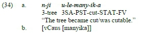 Across languages, the morphosyntax of the middle construction is similar and closely relates to passive and anticausative constructions in terms of argument alternation properties (see Schäfer 2008, 2009; Dom and Bostoen 2018; Jerro 2018). For these constructions, the verb's underlying internal argument surfaces as the grammatical subject. Middle constructions are characterized by their generic meaning. In middle construction, the theme argument denotes a particular property in general, as ubanu 'eucalyptus' in example (28.b) indicates.