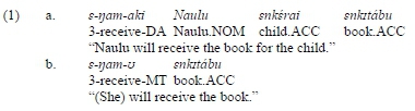 DA elements referring to animate participants are also compatible with the role of recipient, which arises where "X intends to transfer/transfers entity Z to Y" (Niclot 2014: 276). In such significantly less common instances, the DA referent (e.g. olalafe 'brother') receives the entity being transferred (e.g. enkitábu 'book' in (5)).
