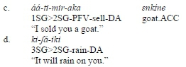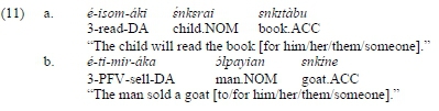 If the DA construction implies some kind of motion (see eiriwakaki 'he/she/it sent' in (7.a) and enajaki 'he/she/it throws' in (7.b)) and the DA element is animate (see ßaßa 'father' in (7.a) and enkltej in (7.b)), the semantic role of DA elements may be viewed as intermediate between a prototypical goal and a prototypical beneficiary/recipient: