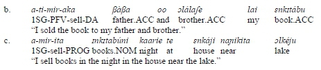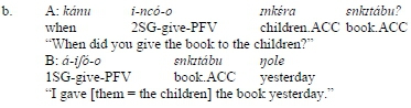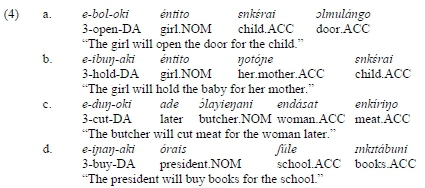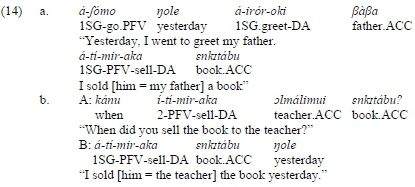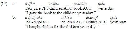 Third, DA elements act as objects as far as their position in the clause is concerned. As is true of other Maa varieties (Hamaya 1993: 11; Koopman 2001: 11; Lamoureaux 2004: 13), the basic or unmarked word-order in predicate-focus clauses in Arusa is VSO (Levergood 1987: 20; Karani 2013: 23; Andrason and Karani 2017b: 208-209), although other linear arrangements are also possible under determined syntactic and/or pragmatic circumstances (Karani 2013: 2324; see also Tucker and Mpaayei 1955; Payne 1995; Payne, Hamaya, and Jacobs 1994; Koopmann 2001: 11; Caponigro 2003; Lamoureaux 2004: 13; Carstens and Shoaff 2015).26Constituting a VSO-prominent language, the verb tends to appear clause initially, being followed by the subject and the object. In unmarked clauses, non-terms such as locative and temporal adjuncts follow the objects as clause-peripheral entities. In ditransitive constructions, the NP referring to beneficiary (see mkéra 'children' in (17.a)), recipient, or source appears after the verb and the lexical subject (if the latter is expressed lexically) and before another NP referring to theme (énkitábu 'book') and any adjunct (nole 'yesterday'). The word order of DA elements is identical. In unmarked clauses containing DA verbs, the DA element with the role of beneficiary (see inkéra 'children' in (17.b)) occupies the position after the verb and, if expressed, the lexical subject, albeit in front of theme elements (ilkaráfi 'clothes') and adjuncts (nole 'yesterday').