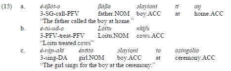 First, DA elements behave as genuine objects from a morphological perspective. All objects in Arusa are marked by the so-called accusative case. The accusative is typically encoded by a low tone falling on the first syllable of the stem, and a high tone elsewhere (see olayíoni 'boy' in (15.a)), or by only a low tone in a few two-syllable words (see nkifu 'cows' in (15.b)).23 It should, however, be noted that the accusative is not exclusively used with objects. It is also employed with adjuncts introduced by the prepositions such as te/to/ti 'at, to', aatua 'into', or oo 'with' (see ti ση 'at home' in (15.a)) and with complements of motion verbs. DA elements are, without exception, marked by the accusative (see olayioni 'boy' in (15.c)). However, adjuncts accompanying DA verbs may also exhibit the accusative marking (see to osingolio 'at the ceremony' in (15.c).