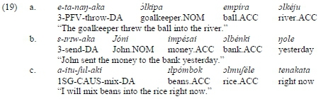 There are, nevertheless, instances where the DA element appears after the theme even though no focus on the latter constituent is involved. This occurs if DA elements are inanimate and assume the semantic role of goal (see olkéju 'river' in (19.a), olbénki 'bank' in (19.b), and olmuféle 'rice' in (19.c)). This phenomenon is fully consistent with the behavior of other ditransitive constructions in Arusa, not only DA constructions.27 Even in such instances, however, the DA element typically occurs in the position before adjuncts (see jole 'yesterday' in (19.b) and taisere 'tomorrow' in (19.c)).