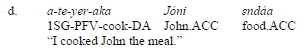 The addition of the DA suffix to a verb usually results in the creation of a new item in the valency pattern of that verb - the DA element. If the basic verb is intransitive (see yaij 'breathe' in (2.a)), the subsequent valency pattern involves two elements: a subject and an object (2.b). If the basic verb root is mono-transitive (see yerr 'cook' in (2.c)), the valency of the DA construction involves three elements, and the verb becomes ditransitive (2.d).