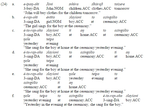 The positional restriction - or the flexibility - of DA elements seems to be analogous to that exhibited by arguments. In general, in Arusa, arguments and adjuncts exhibit a similar degree of syntactic freedom. As mentioned previously, in unmarked clauses, DA elements (mkéra 'children' in (24.a)), like any object argument, appear between the subject (Jóni 'John') and the adjunct (taisere 'tomorrow'), usually before the other object - theme (ilkárafi 'clothes'). In contrast, adjuncts are found after the subject and any potential argument (see taisere 'tomorrow' in (24.a) and to osingólio 'at the ceremony' in (24.b, 24.c)). However, the overall mobility of adjuncts seems to be slightly greater than that of DA elements and arguments overall. The sequences of two objects of which one is a DA element (i.e. DA + theme) allow for one alternation (i.e. theme + DA) that occurs under two circumstances: if the DA element is an inanimate noun with the semantic role of goal; or if focal reading is necessitated.32 In contrast, the sequence of adjuncts may be altered in a greater number of ways - each adjunct can be moved to any position in the sequence (compare te an to osingolio nole teipa 'at home at the ceremony yesterday evening' in (24.c) and to osingolio te an nole teipa 'at the ceremony at home yesterday evening' in (24.d), and nole teipa to osingolio te an 'yesterday evening at the ceremony at home' in (24.e)). Moreover, adjuncts may be placed in a clause-initial position (24.f).
