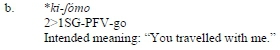 However, if the DA construction is derived from a motion verb - whether intransitive such as kwét 'run' in (3.a) or transitive such as irriw 'send' in (23.c) - the valency pattern may remain unaltered (compare with (3.b) and (3.d), respectively; cf. Lamoureaux 2004). In such cases, the semantic role of 'goal' is encoded by a prepositional phrase instead of being expressed by the DA element, as is otherwise typical of DA forms (see further below).12