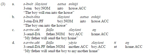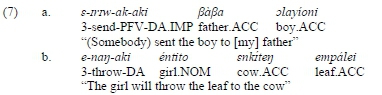 15 Note that in (8), the semantic role is deduced from the meaning of the basic verb and the DA suffix, as well as the broadly understood context - pragmatic knowledge of the real world. Compare with a non-DA construction: eitai éndasat olkáraha te enkérai (lit. gloss: 3SG.remove woman.NOM cloth.ACC from child.ACC) 'The woman will remove the clothes from the baby'. Given the scarcity of verbs with which DA elements assume roles other than beneficiary, recipient, and goal, we view the traditional label 'dative applicative' as appropriate.