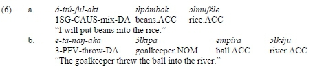 Another semantic role commonly associated with DA elements in Arusa is that of goal. This role regularly appears in situations where an applicative verb implies the idea of motion (see aitufulaki 'I will put' in (6.a) and etanajaka 'he/she/it threw' in (6.b)) and where DA elements are inanimate (see olmuféle 'rice' in (6.a) and olkéju 'river' in (6.b)).