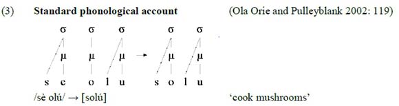 Because the output of the phonological process is now structurally different from a simple short vowel (which projects only one mora - see the structure in (3)), there is a phonological reason why the remnant vowel should be phonetically realised longer than a simple vowel. Yorubá has no contrastive vowel length distinctions, so the remnant vowel, even though it is only ~12 ms longer than a short vowel, is the phonetic realisation of a Yorubá long vowel.3