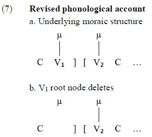 Alternatively, because of the phonetic differences found, the other option is a revised phonological account where the process is no longer treated as full deletion, but rather as root node deletion plus compensatory lengthening: the remnant vowel will lengthen due to being reassociated to the mora of the deleted vowel root node. However, this account is not completely straightforward, as the phonetic output of compensatory lengthening usually results in a vowel of which the duration is similar to that of one that is phonologically long.