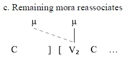While not all previous analyses assume a moraic theory, the structure above fits the description of the standard account. A monomorphemic CVCV word would have the same prosodic structure as the form in (3), as it is assumed that the result of deletion is a phonologically short vowel. However, the phonetic duration of the vowel that remains after deletion suggests that the standard account must be revised, and that the process is more properly analysed as a case of compensatory lengthening.