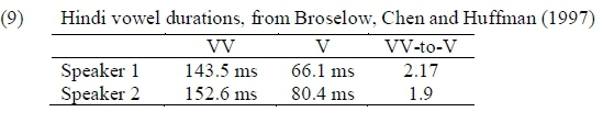 It is clear from the results that the remnant vowels in Yorubá are not as long as would be expected for bimoraic vowels cross-linguistically. However, to emphasise this point further, durations for phonologically short versus long vowels for languages with a true length distinction are given in (9).