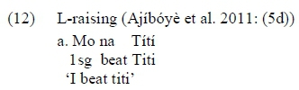 The results presented here are very similar to experimental results of two tonal processes, one in the same syntactic environment as deletion.4 All cases of deletion and lengthening here occur between a verb and its direct object. Ajibóyè et al. (2011) describe a tone-lowering process in this same environment. Yorubá has three standard tones, high (H), mid (M), and low (L), and "[in] Standard Yoruba, before a direct object [...] monosyllabic L-tone verbs are raised to M" (Ajibóyè et al. 2011: 1634). Additionally, there is a HL contour simplification process involving the reduplicative morpheme -ki-. Examples of these processes are shown in (12) and (13), respectively.