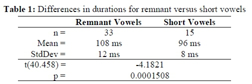 The null hypothesis under the standard phonological account is that there should be no significant difference between the duration of the vowels between the two groups. However, there is indeed a significant difference between the duration of remnant vowels and simple short vowels (t(40.458) = -4.1821 Ρ < 0.001). This is summarised in Table 1, while the means are plotted in Figure 1. The two groups were compared via the t.test function in R.