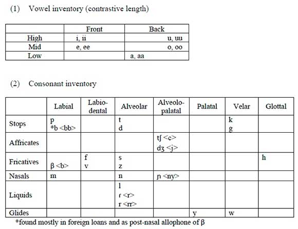 The vowel and consonant inventories of Rutooro are given below in (1) and (2). I employ a practical orthography, where any deviations from the phonetic alphabet are indicated within the consonant chart. The language exhibits a vowel length contrast which will be indicated orthographically by double vowels. While the language exhibits surface tone on the penultimate syllable of phonological phrases, there is no underlying tone contrast. As tone does not interact with vowel resolution in any way, I do not indicate it here. (It does play a role in distinguishing different types of relative constructions in section 4, and will be indicated in that context.)