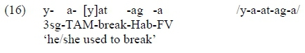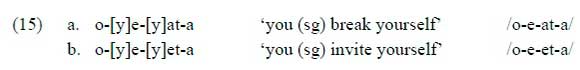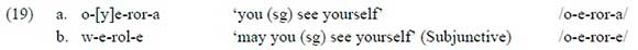 The role of morphology in the determination of the hiatus resolving strategy is even more pronounced when the 2 sg SM is followed by the reflexive prefix /e-/. As seen below, this /o-e/ sequence is resolved by epenthesis in the Habitual tense (signalled by a null TAM prefix and the Final Vowel /-a/) and by gliding in the nearly segmentally identical Subjunctive (signalled by a null TAM prefix and the Final Vowel /-e/).