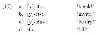 Finally, in the data analysed up to this point, what seems to trigger a resolution process in Rutooro are instances of vowel hiatus, and not simply onsetless syllables. For example, word-initial onsetless syllables are generally freely tolerated, as seen in (10h,j) and (13)-(15). There is, however, one instance in which a word-initial onsetless syllable does get an onset via glide epenthesis. This happens in imperatives which begin with a vowel, as illustrated below. (In the case of (17d), I assume a separate overriding process prohibiting *yi sequences, unattested in the language.)