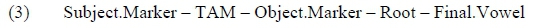 We will see that Rutooro employs multiple strategies to resolve vowel hiatus. As our focus in this paper will be the resolution of hiatus within verbs, it is crucial to understand the various elements within a verb, where the morphology can create VV sequences. The basic morphological structure of the Rutooro verb is given in (3).