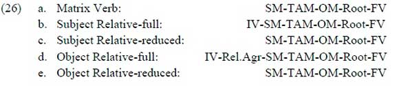 The phrase in (25a) is a matrix clause where the verb is followed by a DP object. The full relative form is presented in (25b). The phrase begins with an object head followed by the verb which contains both the Initial Vowel as well as a relative prefix which agrees in class with the object head. In (25c), the reduced form is presented, which has neither of the two additional prefixes found in the full form, rendering it segmentally identical to the verb in the matrix clause in (25a). The morphology of all five verb forms is summarized in (26).