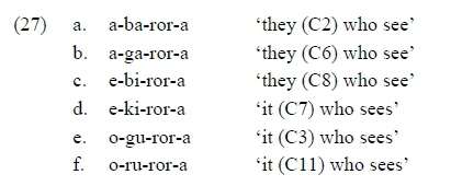 (28b) is odd in two additional respects. First, while the SM is the low vowel /a/, the IV, generally a [-hi] copy of the V in the SM (27), is /o/. Let us remember, however, that the IV also appears in nouns, as evident in the phrases in (24) and (25). In nearly every class, the vowel in the SM and in the nominal class prefix is identical, and the IV is a [-hi] copy of that vowel. The one exception is Class 1. The SM, as we noted above, is /a-/ (realised as /y-/ before TAM prefix /a-/ (21)) but the Class 1 noun class prefix is /mu-/, triggering /o-/ as the IV, e.g., o-muu-ntu 'person', o-mu-limi 'farmer'. Thus, relative clauses such as the one in (28b) seem to be evidence that the IV for Class 1 is always /o-/, even though in this case it is followed by the 3 sg SM /a-/ which has a low vowel.