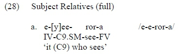 Each of these forms presents issues not yet accounted for. First, in both (28a,b), the SM surfaces as long unexpectedly. In all cases above seen to this point, glide epenthesis never induces CL. We do not expect it to as no mora is added to the form. The unexpected long vowels in (28) can actually lead to minimal pairs of verb forms such as the relative in (28a), meaning 'it (C9) who sees', and the matrix form e-[y]e-ror-a (20j), meaning 'it (C9) sees itself. This could be accounted for (though admittedly unintuitively) by epenthesizing a full vowel (/i/,/u/) to resolve hiatus between an IV and a following SM. Otherwise, CL would be morphologically conditioned just in this context.