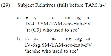 Finally, let us turn to hiatus contexts in full object relatives. Recall from (25) that full object relatives in Rutooro are marked with two prefixes: a relative agreement prefix (which immediately precedes the SM and agrees with the object head) preceded by an IV. Below in (30), we show object relatives with a /CV/ SM.