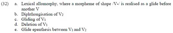As can be seen in (16), these two adjacent identical vowels do not fuse. Rather, glide epenthesis resolves the hiatus. We can account for both the cases in (9) as well as the one in (16) by analysing the former as instances of vowel deletion, as exhibited in (12). If ordered after gliding and diphthongisation, we can formalise vowel deletion in a maximally simple way as the deletion of the first vowel in any /...V-V.../ sequence (i.e., regardless of whether the first vowel has on onset within the morpheme or not). The rule will not apply in (16) as it would result in the complete deletion of a morpheme. It will correctly apply in all the examples in (9) since deletion of the first vowel does not result in the deletion of a morpheme.