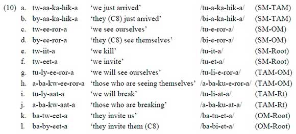 As is true in many Bantu languages, it is not the case that all five vowels are attested in the morphemes appearing in each of these morphological categories. As one example, while all of these (except the Final Vowel) can be vowel-initial or consonant-initial, that characteristic can limit which vowels can occur. This is summarized below.