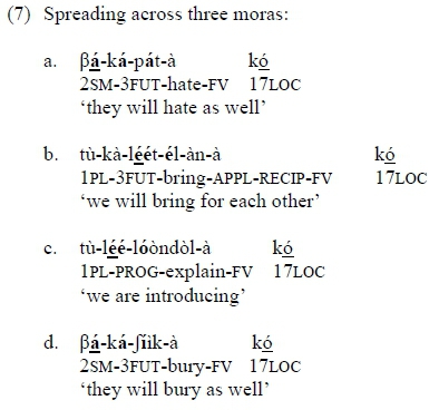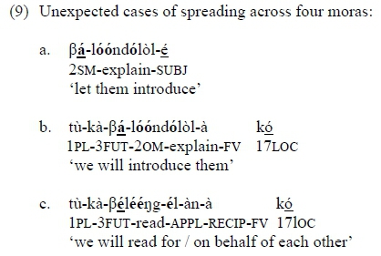 In addition to the above cases of ternary spreading, where the H spread spans three moras, there are also exceptional cases, as in (9) (from Bickmore and Kula 2013), where the spread extends to a fourth mora: