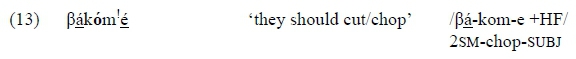 2 This final H is a Melodic High tone which is determined by the Tense-Aspect. It is indicated here in the underlying form, with HF meaning High Final. See Bickmore and Kula (2013) for the full set of Melodic High tones and corresponding Tense-Aspects in Bemba.