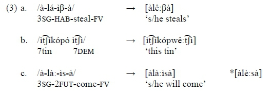 In Bemba, two short vowels result in vowel fusion (Kashoki 1968: 25, Kula 2002: 54ff, Hamann and Kula 2015: 66), as the examples in (3 a) and (3b) show. Identical as well as non-identical vowels undergo fusion. For contrasting vowels, the quality and order of the vowels involved is important in that total fusion only applies between /a/ and a following high vowel. In other cases, when the first vowel is high it turns into a glide, lengthening the remaining vowel. Fusion applies both within morphologically complex words, cf. (3 a), and across word boundaries, cf. (3b). Data are drawn from Kula (2002: 56-57).