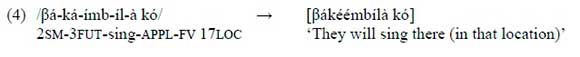 The example in (4) shows that a hiatus of the short vowel /a/ of the future marker plus the pre-NC vowel of the verb root is resolved by total vowel fusion. This is unexpected if the pre-NC vowel is long because, in this case, based on earlier patterns, we would predict avoidance of a three-mora merger. If, on the other hand, the pre-NC vowel is interpreted as short, then (4) would conform with the examples in (3a) and (3b) but contrast with (3c).