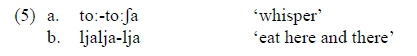 Productive reduplication in Bemba generally involves total reduplication of the verb form. However, there are cases of partial reduplication where the meanings are generally lexicalised or depict onomatopoeic actions. Partial reduplication involves filling a CVCV reduplicant which can be achieved in different ways, as discussed in Kula (2002: 100) and as the examples in (5) show. If the stem is CV:-initial, the initial long vowel is part of the CV:-reduplicant - cf. (5a). If the verb consists of a short verb stem of one syllable, i.e., a C root + FV, then this is doubled in the reduplicant - cf. (5b).