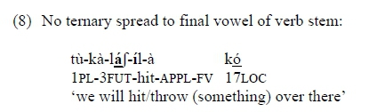 Since lexical long vowels are unquestionably bimoraic, these examples would seem to suggest that H tone spread might not be based on the mora but on the syllable. In this case, all of the examples in (10), barring (10f), would be consistent with ternary spreading at the syllable level, keeping in mind that (10c-d) would also consistently show no spreading to the final syllable, as these are non-phrase final forms (cf. (8)). (10e) shows that if another syllable intervenes, it gets high tone. (10f), however, as well as examples like [tú-léé-lóòndòl-à kó] in (7c) and [tú-kà-léét-él-àn-à kó] in (7b), of which there are many, would always present counterexamples to a syllable-based analysis. We can only speculate that perhaps morphology/Tense-Aspect has a role to play in explaining these contrasting patterns.