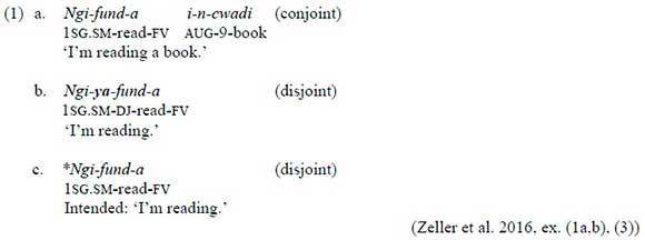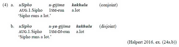 The conjoint/disjoint alternation is one of the hotly discussed topics in Bantu linguistics (see, e.g., the volume edited by Van der Wal and Hyman in 2016). The conjoint/disjoint alternation in Zulu is typically marked morphologically in two tenses: present tense affirmative and recent past affirmative. Recent works by Zeller, Zerbian and Cook (2016) and by Halpert (2016) also look into the prosodic side of the alternation in Zulu. As summarised by Zeller et al. (2016), the distinction in Zulu is generally analysed as a reflex of syntactic constituency: the conjoint form indicates that the verb is followed by material inside vP, while the disjoint form indicates that the verb is vP-final.