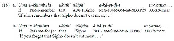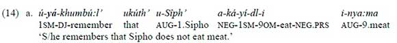 The most clear-cut cases with the disj oint form only or with a very marginal conj oint form are cases involving verbs such as ukukhumbula 'to remember', ukukhohlwa 'to forget', ukuazi 'to know', ukumangala 'to be surprised', and ukudinwa 'to be annoyed'. (14a-d) are some illustrations.