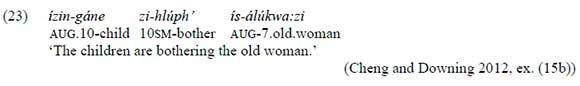 2 See Zeller et al. (2016), among others, for discussions concerning H-tone spread involving a H-tone on prefixes spreading to a toneless verb in Zulu.