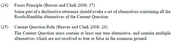 Beaver et al. (2017: 266) summarise the QUD model as follows: "QUD models characterize semantic and pragmatic phenomena in terms of the strategy of inquiry that discourse participants follow [...]". A strategy of inquiry consists of a sequence of questions. This can be easily combined with alternative semantics (Rooth 1985, 1992) connected to information structure, specifically using Beaver and Clark's (2008) Focus Principle (24) and the Current Question Rule (25).
