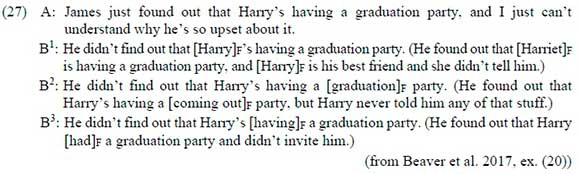 Beaver et al. (2017) argue that focus is linked to QUD because it has a discourse function and because focus is sensitive to context. They further connect factivity to focus and QUD (see also Simons et al. 2017). Consider the utterances of A and B in (27).