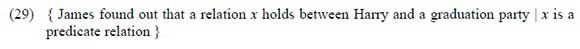 Harry is focused in B1 and, based on Rooth's alternative semantics as well as the Current Question Rule, the set in (28) must have at least one true alternative. That is, there must be at least one individual such that James found out that s/he is having a graduation party. Consider now B3, which is very relevant to the conjoint/disjoint alternation discussion. The focus meaning of B3 would be (29).