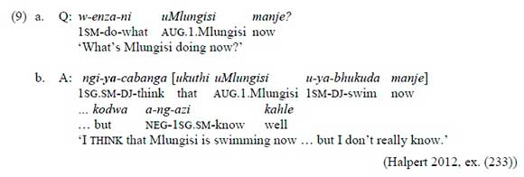The discussion so far mainly concerns verbs and their nominal arguments as well as adjuncts which follow the verb (and verbal arguments). Crucially, as mentioned in the introduction chapter of Van der Wal and Hyman (2016), as well as in Van der Wal (2016), one of the questions related to the conjoint/disjoint alternation concerns the information structure of the alternation. In particular, it is often mentioned that when the verb is in the disjoint form in Zulu, it is the verb that is focused. When it comes to conjoint/disjoint alternation followed by a clause, there are only a few papers, which mainly discuss the type of subordinate clauses and how they relate to the conjoint/disjoint alternation (see Van der Wal 2016 and the works cited therein). Halpert (2012) discusses complement clauses in Zulu in connection with the conjoint/disjoint alternation and, in particular, complement clauses introduced by different complementizers. This paper hopes to contribute further to this discussion, in particular, the interpretation of the conjoint vs. disjoint marking followed by a complement clause.