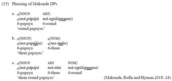Rolle, N. and L.M. Hyman. 2018. Phrase-level prosodic smothering in Makonde. UC Berkeley PhonLab Annual Report 14. Available online: https://escholarship.org/uc/item/4w58812r. https://doi.org/10.5070/p7141042473