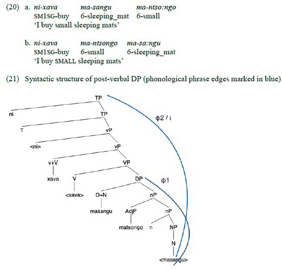An alternative analysis of the pre-nominal modifier with PL in post-verbal position is that the modifier forms its own syntactic phrase (either a DP or a DP-linked phrasal category such as DemP) which appears in the immediately-after-verb (IAV) position. This position is known to be focused in a number of Bantu languages, including Xitsonga (although this requires further study), and is therefore marked prosodically for focus. Such an analysis would be closer to Van de Velde (2020) but would not account for the additional PL in pre-verbal position, which is not a general focus position in Xitsonga or any Bantu language, apart from the problems noted above. We therefore do not think this is an IAV effect (syntactically). However, more research on the prosodic marking of elements in IAV and how longer and shorter phrases of different types behave in Xitsonga would be needed to evaluate this prosodically.