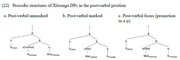 The prosodic phrasing of post-verbal DPs is shown in (22). The projections of the noun and modifier in (22a-b) are not matched by a phonological phrase in the prosodic structure because each only contains a single prosodic word. In Xitsonga, phonological phrases are required to have minimally two prosodic words, hence they are prosodic words which do not form phonological phrases on their own (see Lee and Selkirk forthcoming). The underlying structure in (22a) differs from (22b), where the pre-nominal modifier is focused. We propose that the focused pre-nominal modifier is promoted to a phonological phrase (q>Foc), as shown in (22c). We argue that this promotion to 9 is the source of the longer PL in the focused pre-nominal DP.